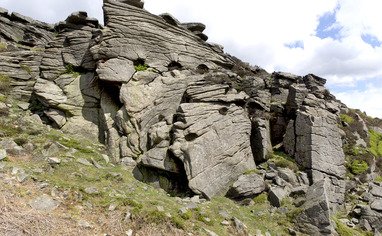 New Road is a small lane, which starts 200m south of the Yorkshire Bridge Inn on the A6013 Bamford-to-Ladybower road and runs uphill to the Dennis Knoll parking area (Stanage). Approximately 1.7km from the junction with the A6013 (1.5km from Dennis Knoll) there is a wooden gate and stile on the northern side of the lane. Park in grassy lay-bys as close to the gate as possible. Cross the stile and take the left-hand of two well-marked paths. After 30m the paths split: again take the left-hand alternative, following a trail diagonally leftwards across the hillside to reach the Gun Buttress Area at the right-hand end of the crag (10 minutes from P). Well-marked paths lead leftwards from here along the base of the crag, running as far as the K Buttress, but beyond that the going becomes more indistinct. The far left-hand buttresses (Great Tor Area) are better reached by dropping down from the major path running along the top of the crag.