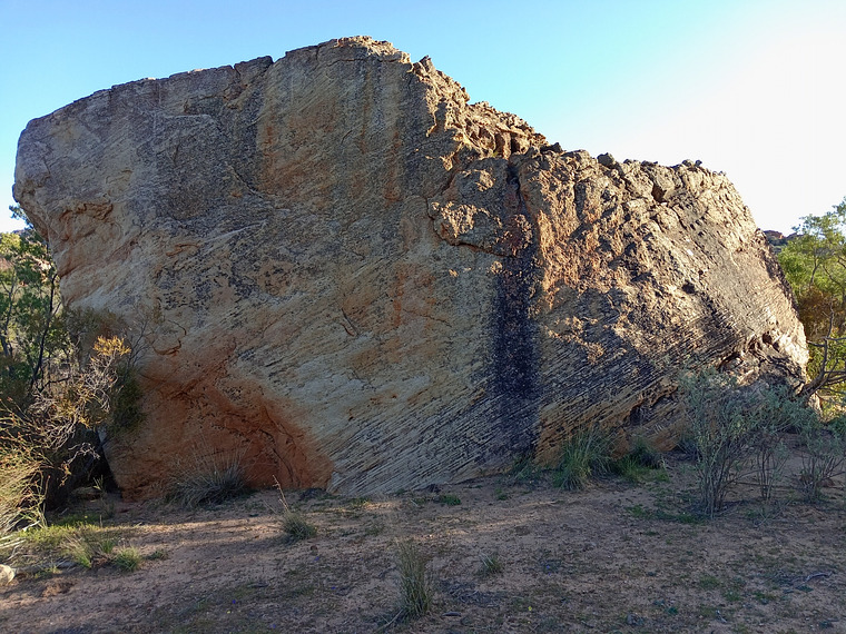Start on good flake at the left of the boulder. Head straight up and slightly right to top out.