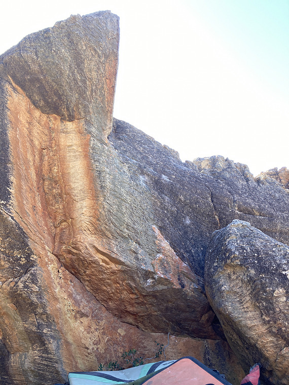 sit start with small holds on lip of small roof, climb thin face to top. Can be topped out either left (scary and committing) or right (slopey and balancy)