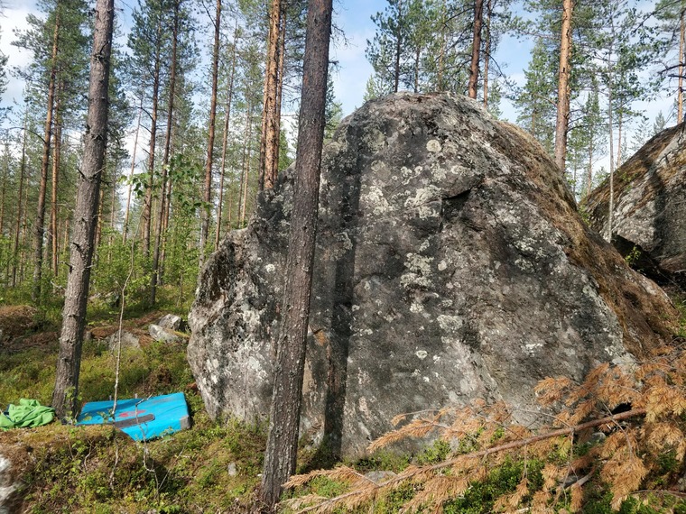 Sit start (same as Musta Lammas), climb along arete, top out highest point