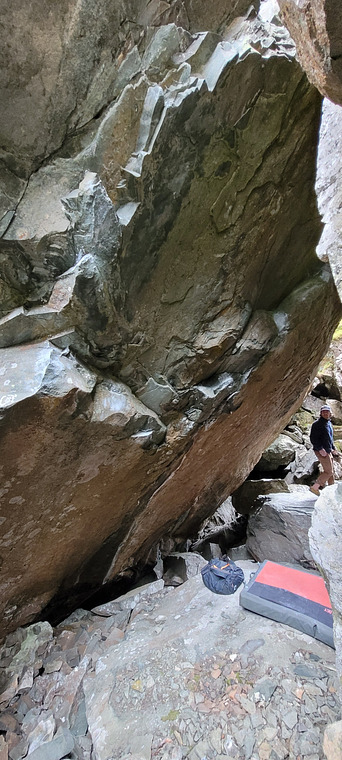 Start with both hands on a big slopy list, then head right. Top hold finish.