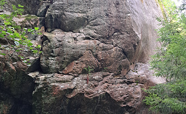 Ravinväggen: Från parkeringen: Följ grusvägen förbi stugan och vik av vänster efter ca 80 meter, in på en tydlig stig som leder ned i ravinen. Inom kort bör du kunna se väggen på andra sidan bäcken. F... Read more
