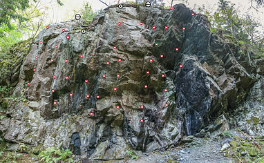 Varierad klättring med allt från 45-graders tak till sprickor och potential till både lätta och hårda leder (8b?). Utveckling pågår, men känn dig fri att delta! Kom och testa. Förvånande fint!