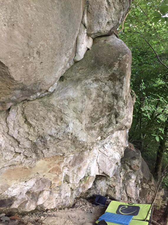 Start on the big juggy slot, go up and left through the face and up the arete. No topout, finish matching the horizontal crack at the top of the arete.