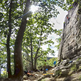SHERIFFEN is the middle part of the crag with some slabby trad routes and the hardest (bolted) routes of the crag. Trees in its lower part shade the sector. Some of the cracks stay wet for a while after rain.