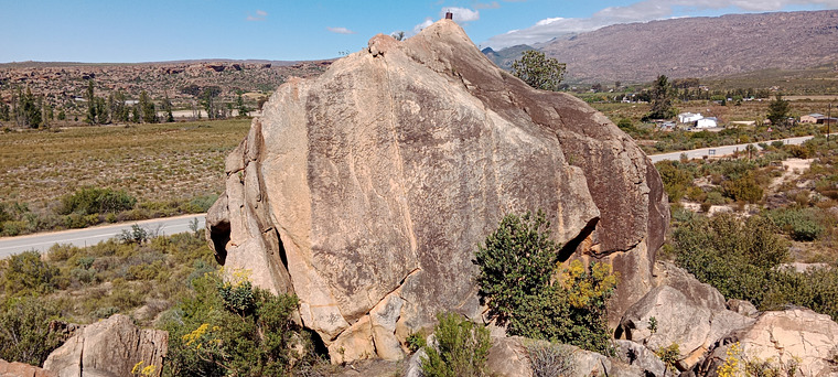 Sit start on the block, make your way up and right into the diagonal crack, to the corner with the Vert crack, then start moving diagonally left up the face along thin Gaston crimps to a jug on the left arete, and then up to the top.