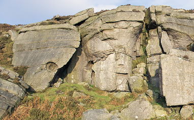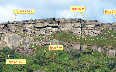 New Road is a small lane, which starts 200m south of the Yorkshire Bridge Inn on the A6013 Bamford-to-Ladybower road and runs uphill to the Dennis Knoll parking area (Stanage). Approximately 1.7km from the junction with the A6013 (1.5km from Dennis Knoll) there is a wooden gate and stile on the northern side of the lane. Park in grassy lay-bys as close to the gate as possible. Cross the stile and take the left-hand of two well-marked paths. After 30m the paths split: again take the left-hand alternative, following a trail diagonally leftwards across the hillside to reach the Gun Buttress Area at the right-hand end of the crag (10 minutes from P). Well-marked paths lead leftwards from here along the base of the crag, running as far as the K Buttress, but beyond that the going becomes more indistinct. The far left-hand buttresses (Great Tor Area) are better reached by dropping down from the major path running along the top of the crag.
