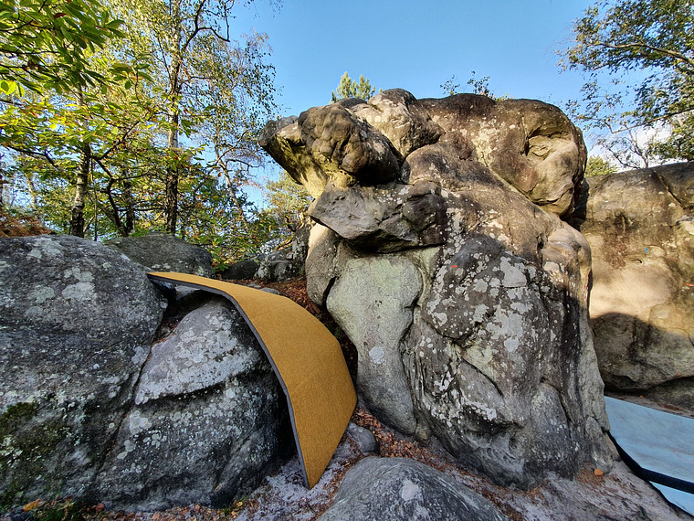 Orange 99 (Hameau!). Continue on the right boulder and topout on the small boulder just right of Red 6!