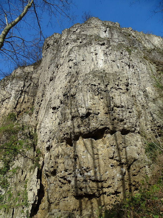 Quite hard for the grade. Spaces bolts. Go left at small roof with black patch below.
