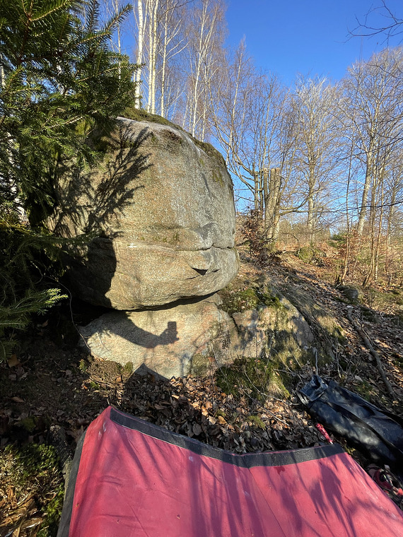 Sit start with hands on top of the nose. The block/ledge supporting the main block is eliminated for feet. Short but fun, harder than it looks.