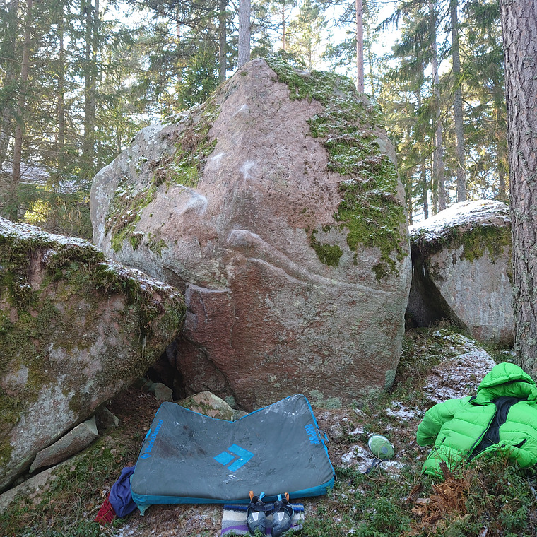 En ganska cool och uppenbar linje som är belägen strax nedanför blocket med 'Disciplin'. Avtäckt från mossa redan förra sommaren, men då saknades inspirationen. Idag var det krispigt och helt vindstilla. Några intensiva press på denna blev bra pausunderhållning för Axel som värmde tårna sittandes i lotusställning mot ett träd - med tumvantar på fötterna.