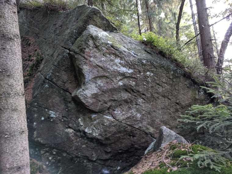I don't know the boulder's author or the grade. It's about 6A. Leave a comment if you know the details and we'll add/change them. The block is located about 10 meters below Kámen Od Herbika.