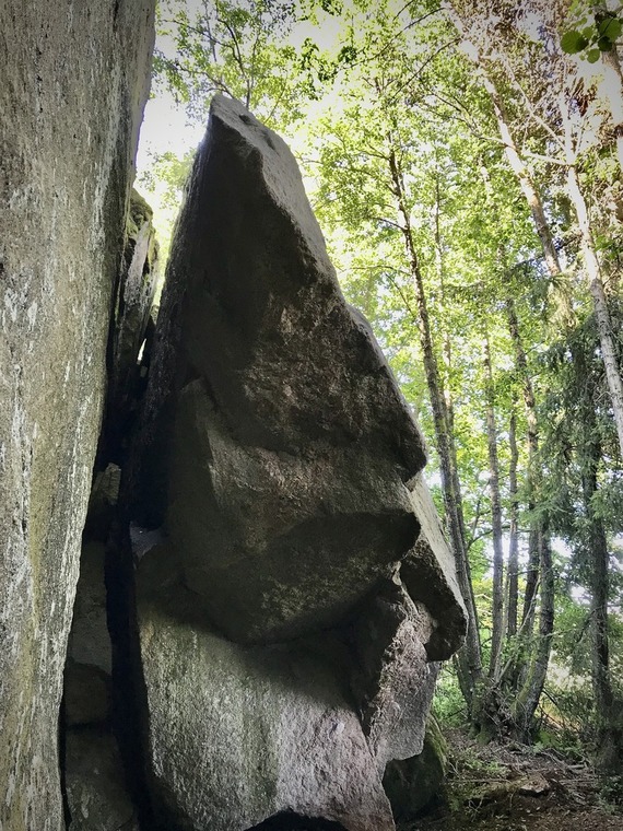 Høy og atletisk bulder på stort sett gode tak. Bruk blokker til å scramble opp til startbøtta, så videre på bøtter og krimper ut på eggen.