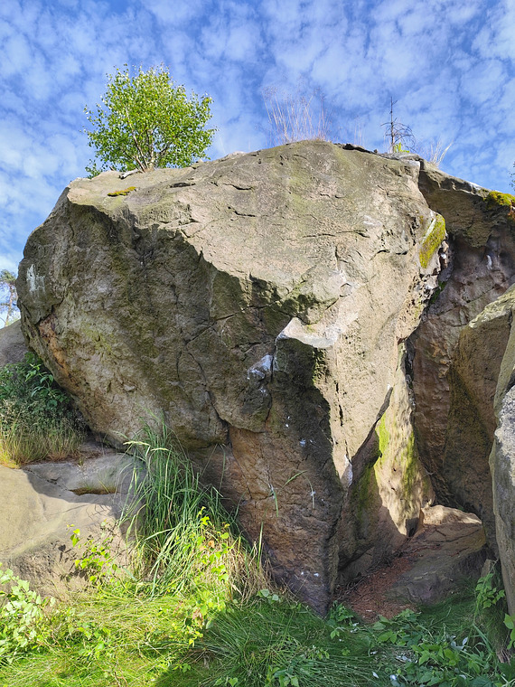 SD - start z bočáku nízko na převislé hraně, vzhůru do dvou chytů a zprava přes další chyty v hraně do plotny a tou lehce k vrcholu.