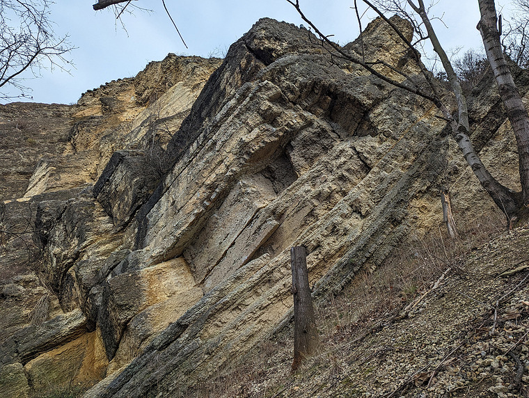 Traverz převisem a vzhůru ke společnému slanění.