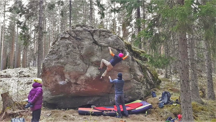 Punakivi is a block of red granite that is partially a bit sharp, but generally speaking the rock quality is ok. Problems on Punakivi are 2-4 metres high and the landings are mainly good. About half of the rock is in the shades practically all day long, and the other half is shaded by the surrounding trees in the evening. So it makes a good spot even during the sunny summer days.
