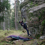 Buddhanluola consists of two boulders leaning on each other, creating a small cave. Problems in Buddhanluola are low, about 2-3 metres. There are easy slabs and harder overhangs that vary ca. between 6B-7A. Landings are good, so on most of the problems you'll get along with just one pad, or if you wanna play safe, bring two of them. Only on traversing problems you'll need 2-3 pads.