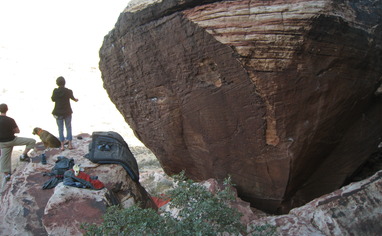 East Side of Boulder - Caustic Cock 5.11b Classic 4 bolt sport climb up the prow of the rock. Best to stick clip the 1st clip. Please be careful climbing here as there is Rock art near start of the climb.