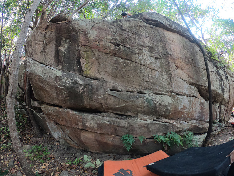 Stand start on a jug on the left corner. Go up the the right using horizontal holds then exit over the top boulder.