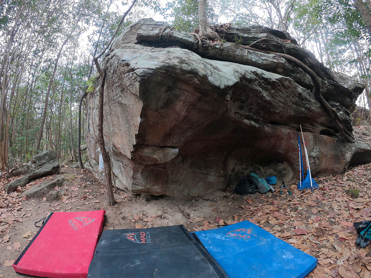 Start at a low horizontal crack and traverse to the left using some slopers. Exit on the left face near the root.