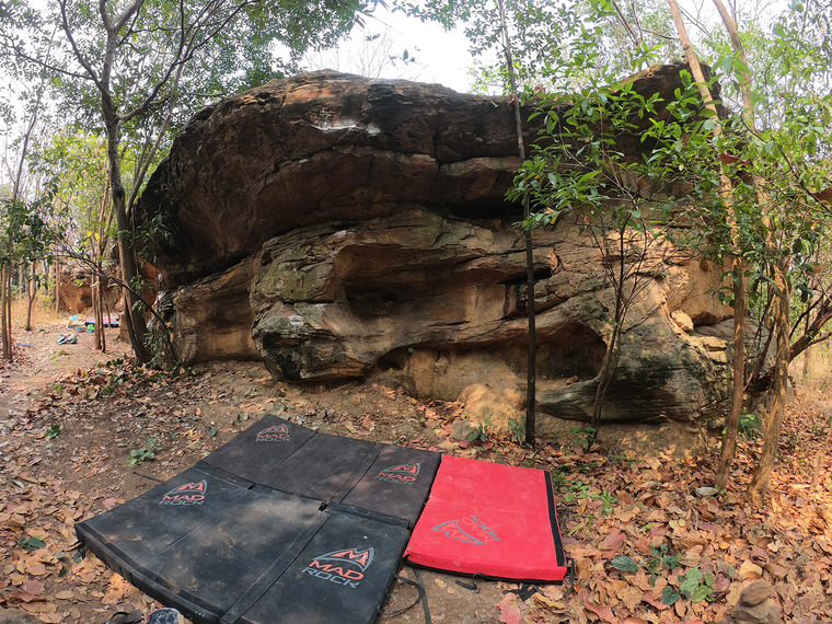 Sit start at the overhang. Climb slightly to the right. Sloppy exit.