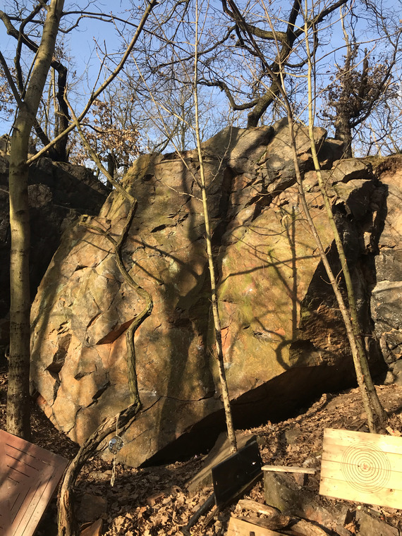 Zestoje uplne vlevo a travers spodem doprava do topu diabolky. Travers from left to right to Top boulder Diabolka.