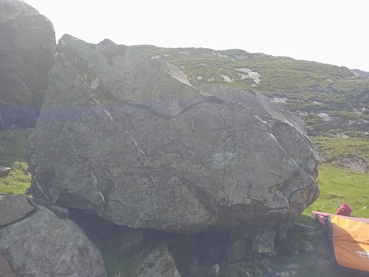 From standing, grasp the large sidepull, step on to the lip and slide up the arete. Nice easy moves