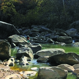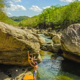 CSX is a true New River Dries experience. Large, water smoothed boulders sit along and in the river. Although often under-featured, the lines that do emerge on the Dries tend to be pure and proud. The area is a delight to explore even without the climbing, a new section of river bank hidden behind each boulder cluster. Comfort with navigating riverside talus is helpful, as while all of the boulders sit in a narrow strip between the cliff line and water, there may be only one narrow, cryptic path. Climbing over and between boulders is often required. The rough terrain has its benefits -- it is rare to see other people here, even fellow climbers. This area caters most to the V8-V10 climber with "Judah" and the "David and Goliath" variations being unique-for-the-New, non-morphologic roof climbing on small crimps/edges.