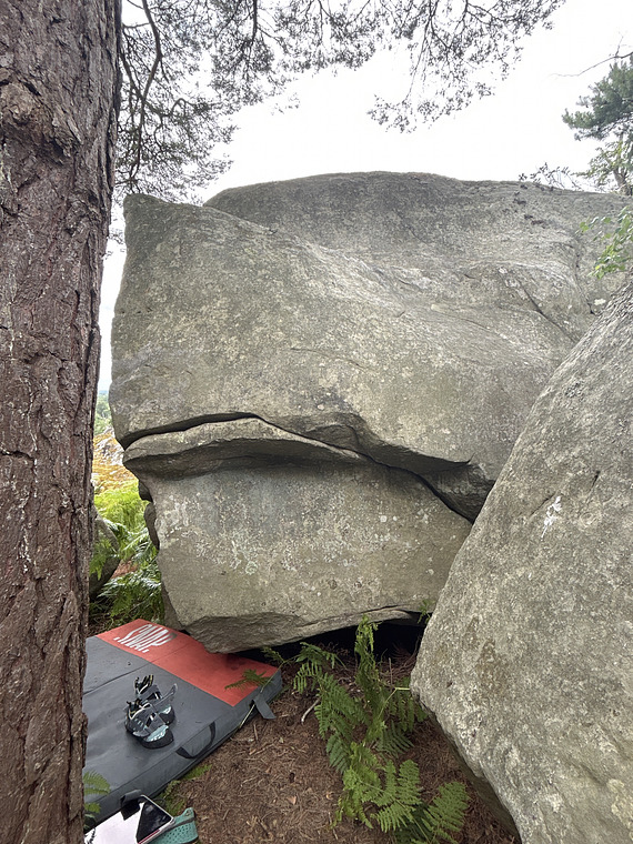 Right hand start on far arête, left hand in crack on the left jut. Climb up using arête or juggy crack