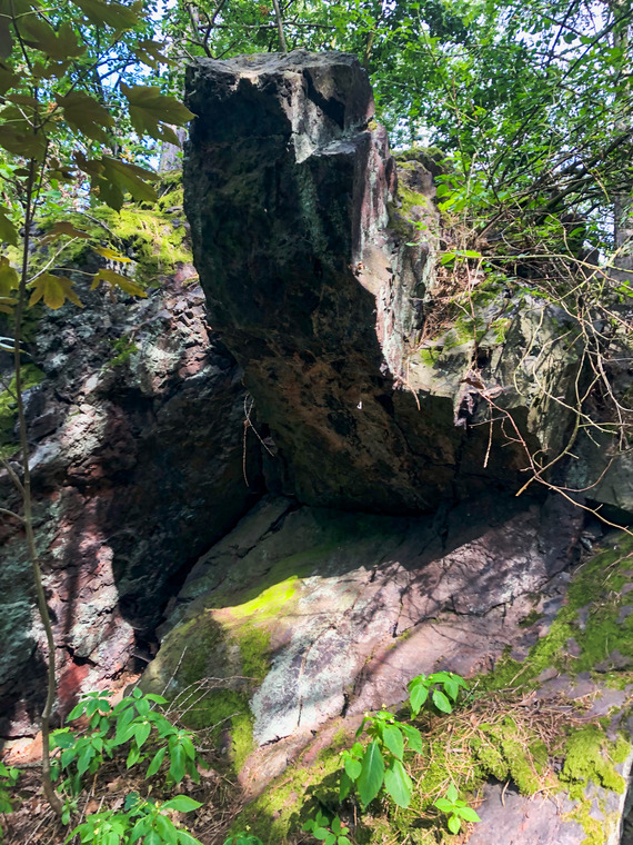 Nástup nohama v plotně a ruce na skále někde pod šipkou. Dál rovně do převisu a u konce převisu mírně zprava výlez na špičku kamene. Zákaz
