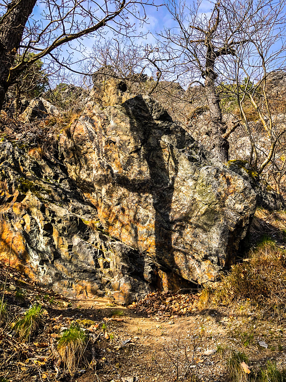 Traverz zprava doleva rukama po horní hraně. Pak výlez v nejvyšším bodě skalky. Bez odšlapu na předskalí.