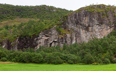 Følg dalen innover til en passerer ei lita betong bru og en parkeringsplass på høyrehand. Her kan en se veggen rett fram på motsatt side av et stort jorde. Her deler veien seg i 2, en skrår opp mot ve... Read more