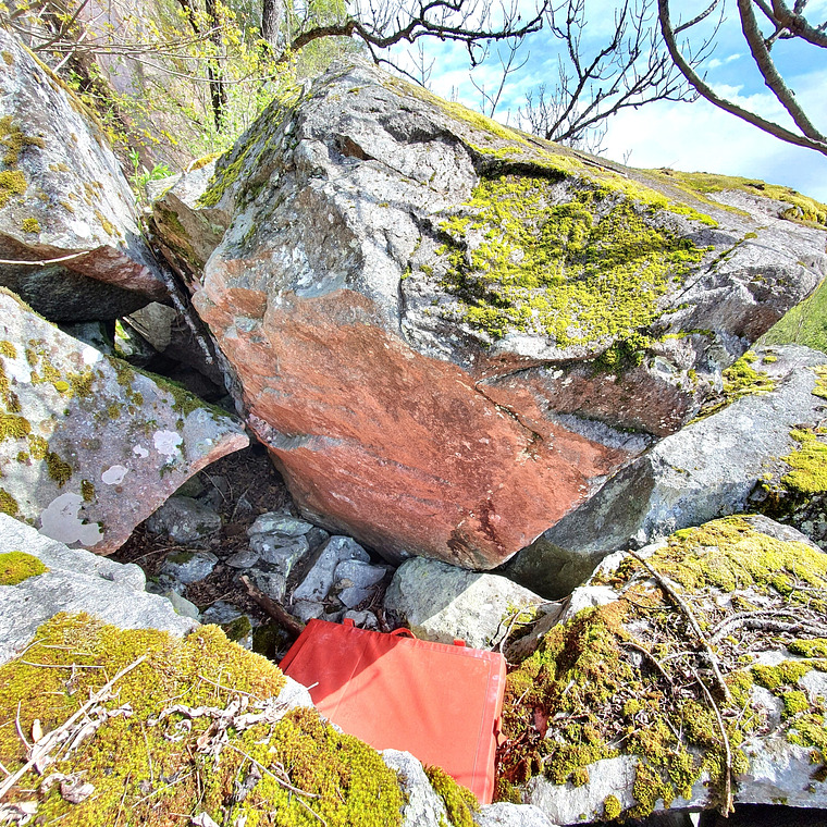 Ligger høyt i ura. Starter med en hånd på hver side av steinen
