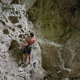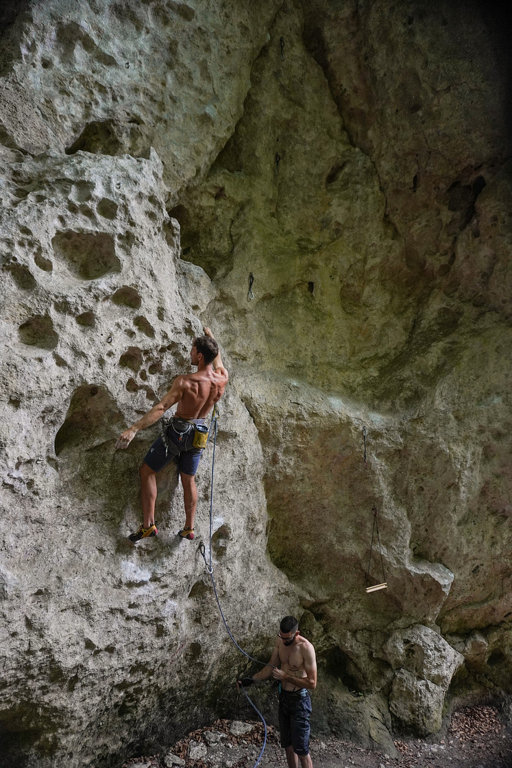 The rock is compact grey and white limestone, featuring short, bouldery, and highly sensory lines where strength, route-reading, and intuition come together. Some first bolts are a bit high or poorly placed, so caution is advised — using a long quickdraw or even a natural thread may be wise in trickier situations.