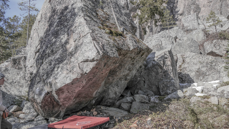Sitstart on two crimps down low by the bulge. Then follow the arete right up to the corner and mantle.