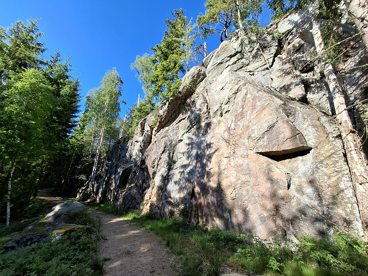 🌳 Follow the walking trail that continues to the right (north) from the parking. After 500 m you are at the rightmost part of the cliff. The trail is a bit hilly but the ground is good so even a baby stroller can be brought along.