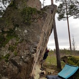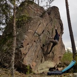 Best season is usually early spring. The boulder is located on a hill facing south/south-west and can dry fast if there is sun and/or wind. The boulder is ~4-5 meters and the landings are good, but it's definitely good to have an extra pad or two for the high topout to pad the boulder below (see photos).