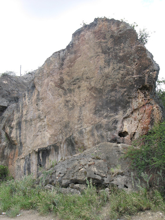 The bolted line to the right. Up steep rock, using sidepulls and underclings to reach a hole. Then, veer left onto the headwall. Thin climbing to the anchor. Easier alternative: stick to the edge. In 2021, 1 bolt was added (between the 2nd and 3rd) to offer additional protection to strayers who go off course to the right. 5 bolts to "U" anchor with ring
