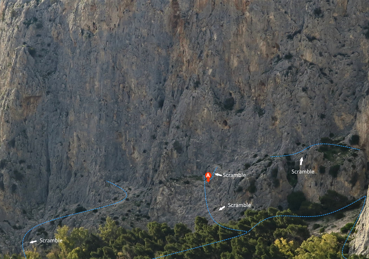 Approach: From left, first scramble to the Ebola bay and then perform a second scramble to the right of a tree to an upper ledge. From right: go through sector Suizo and continue scrambling leftwards.