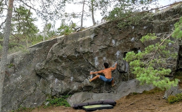 Fruberget is perfect for both beginners and experienced climbers. Most of the problems are on caves or overhangs but there are also some good slabs. Landings are generally good but for some problems you definitely need more than one pad. The best time to visit Fruberget is from Spring to Autumn. The sectors Lilla grottan and V-väggen are on top of the hill where there is pretty windy, so there are the sectors that dry faster after raining.