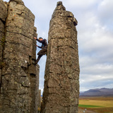 Gerðuberg is a row of basalt columns up to 14 meters tall, located in Snæfellsnes. Loads of vertical crack climbs can be found here, but the logged and most popular climbs count around 30. The climbs here are almost entirely crack climbs, generally very well protected and they can range from thin seams to gaping chimneys. The grades range from 5.4 to 5.11d but when compared to e.g. Stardalur, there is a limited amount of good beginner routes, the best climbs in this area are typically around 5.8 and up. Placement of in-situ protection (bolts and pitons) is prohibited and generally not necessary, but since the making of top anchors can prove problematic at times, lone bolts can be found at the top of some columns to make life a little easier.
