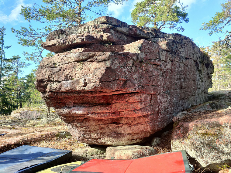Sitstart like Takeaway under the roof. Traverse to the right, top out on the right site.