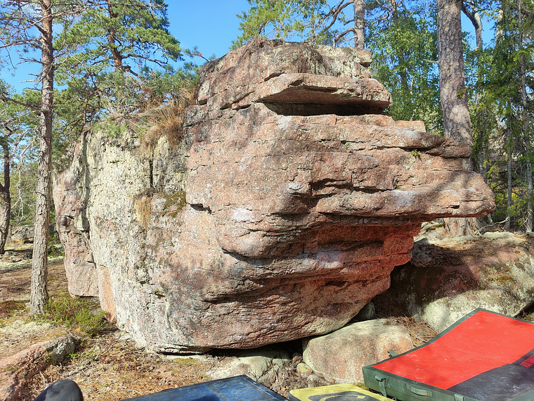 Sit start far right under roof. Traverse from right to left using the holds on the shelf. Mantel top out on the left side of Takeaway.