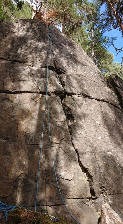 6c/7a-registret kändes det som. Fantastiskt roligt sportig trad som är välsäkrad men som kräver lite kompetens i säkringarna för att inte bli allt för run-out i slutet. Med finbeta i slutet blir den jämnt hårdare hela tiden, annars blir det kämpigt hårt sista metrarna.