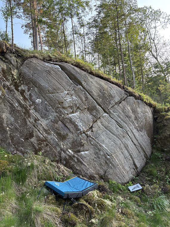 Start at the bottom of the big diagonal crack in the wall, follow the crack all the way up and mantle up. FA Santi Pagola.