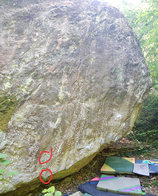 sit start with holds circled in red, climb the wall to the right and exit as highball trap