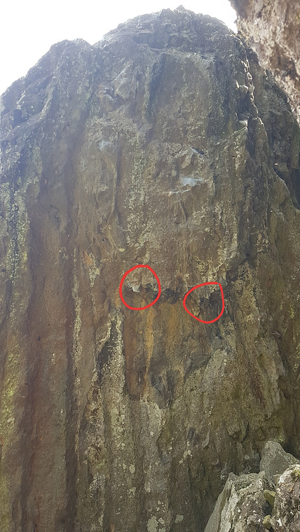Morpho. Start with the two holds circled in red, climb the wall, exit on top. A sit start is possible but doesn't change the difficulty. It's all about 1 mouv, which makes it very difficult to grade. Climbers taller than 175cm will be able to use different footholds which will change the move and most likely the difficulty.