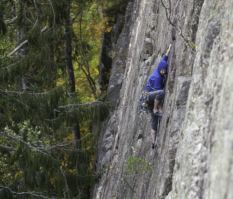 Bolts have also been placed on this rock, but so far almost all routes require nuts and cams to be protected in a secure manner. Climbs such as Löjliga familjen, Skinnhissen, Stålmannen and Lex Luthor are some examples of this. The latter is made by Henrik Bolander, one of the better on-sight climbers at the time in Sweden. Henrik used to cope with hard repetitions very quickly, either on-sight or after only a few attempts.