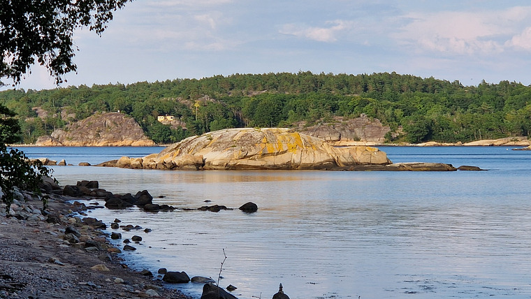 Starts on the southside/backside (to the water) of this small island. You can go there without getting wet. Then traverse from just above the water on the lowest line to the right (maybe 10 m) and up.