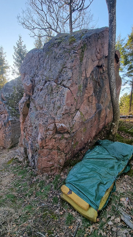 Start both hands on diagonal ledge to the left of the tree, then traverse left and up. Top out.